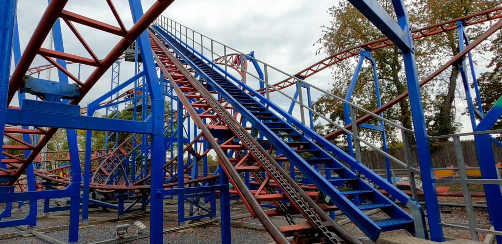As we walked up to the red and blue coaster, no one was in that area of the park working the rides. There were only a few employees working outside at the time anyhow. A worker told us they’d be over in a minute, so we waited. That’s when a second employee walked over, looked toward us, and said, “This ride is down right now. They’re going to fix it.” and proceeded to walk away.