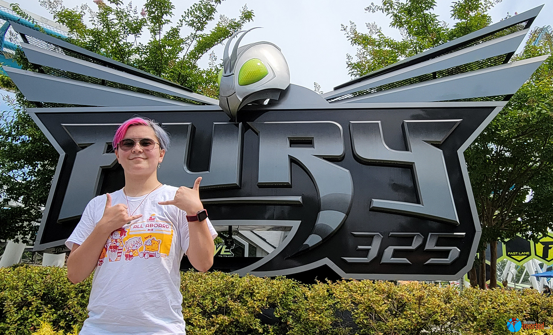 For years I have been singing the praises of Afterburn to Sam. Since she began her trek into becoming an enthusiast and getting over her fear of coasters last year, one ride model she’s really enjoyed are Bolliger & Mabillard (B&M) Inverted Coasters. I guess that’s fitting with a site name like, “We Were Inverted,” huh? Anyhow, Great Bear at Hersheypark was her initial favorite when she barely had any credits to her name. Alpengeist at Busch Gardens Williamsburg (BGW) took that spot after riding it her first time. And finally, Dorney Park’s Talon was always a favorite for her. Now she’s added Afterburn to the list.