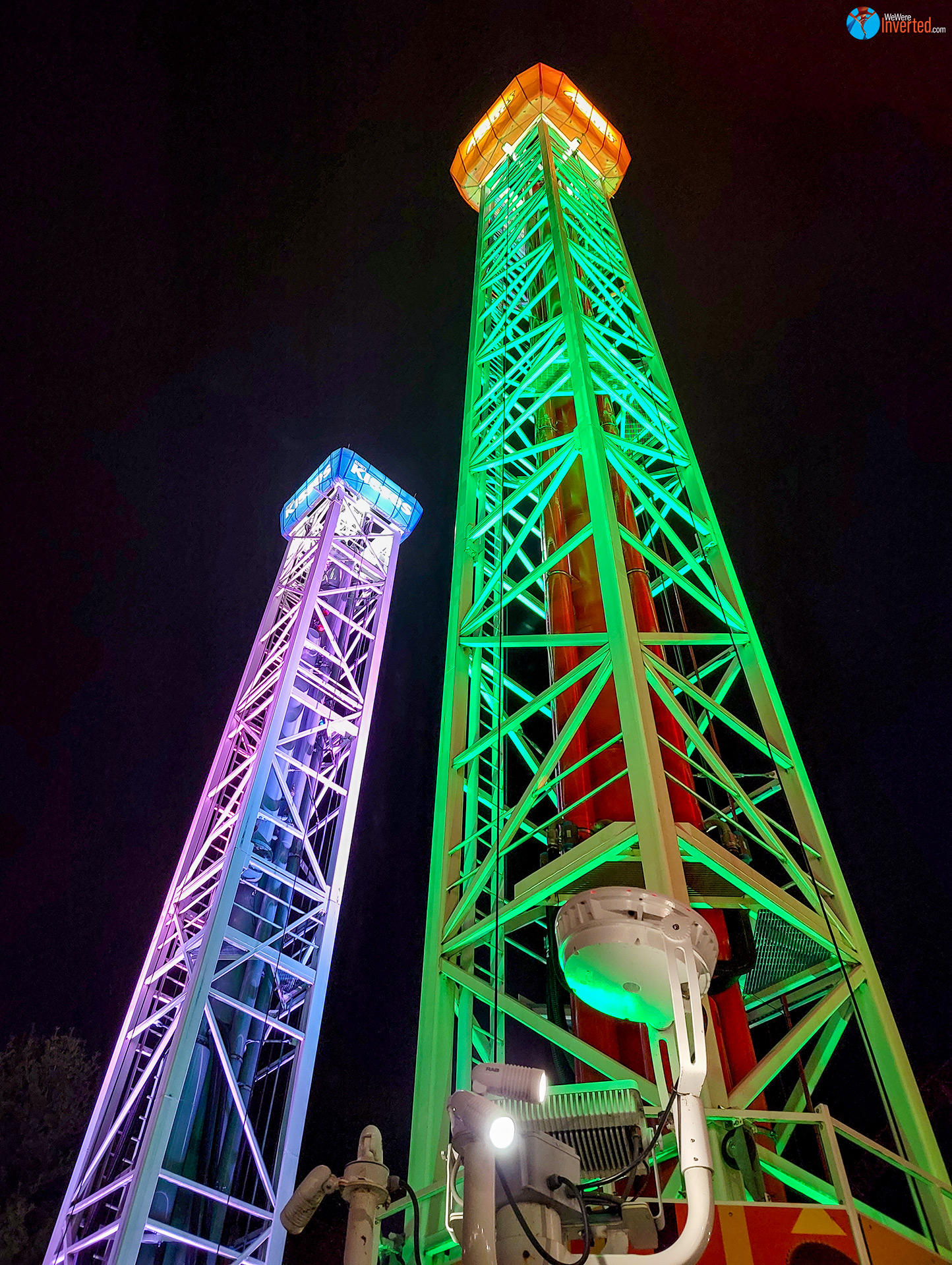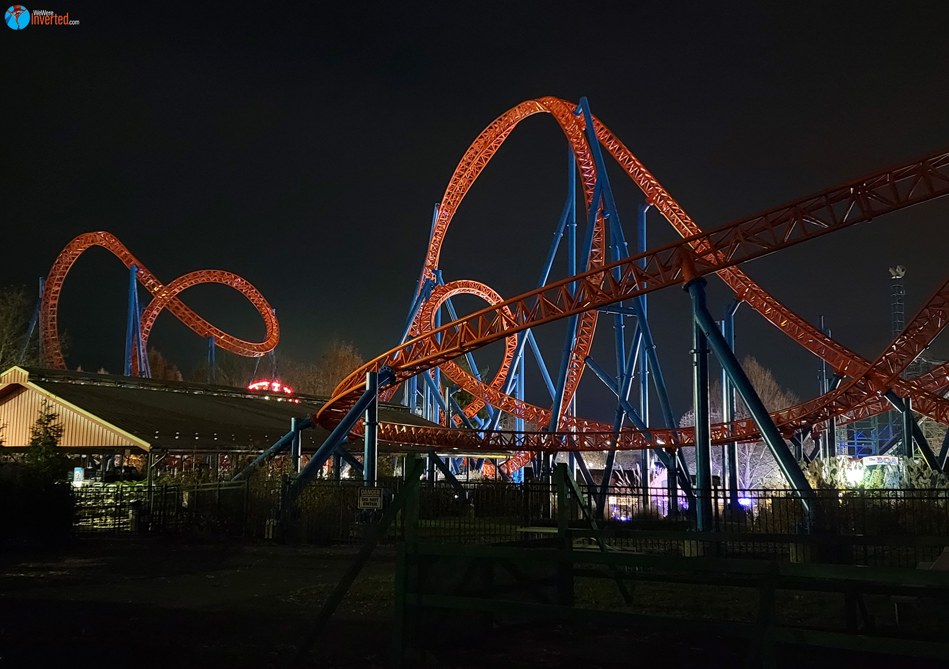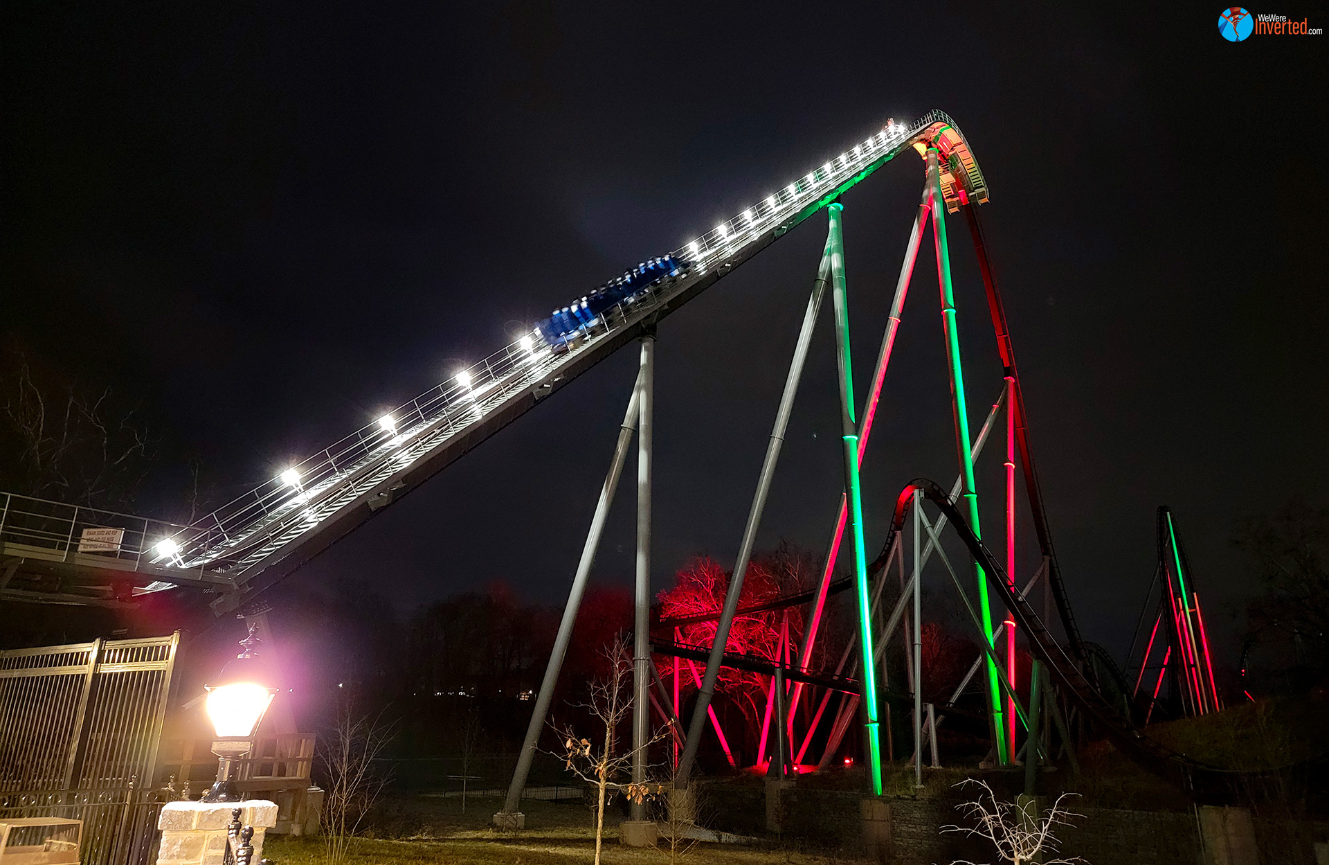 Even with one train operations on Looper, there was little to no line. We waited for only one train before boarding and making the slow, climb up the lift in almost pitch black surroundings. As we were getting ready to leave the station, an actual train drove past the park up on the hillside behind Looper, Great Bear, and Coal Cracker. You could barely see it, although you sure could hear and even feel it rumble. I loved it! Night rides are amazing and aside from the newly painted white loop, it was hard to make out just which way the track was about to turn. Well, aside for the tunnel. The tunnel was lit up inside, which I found weird.