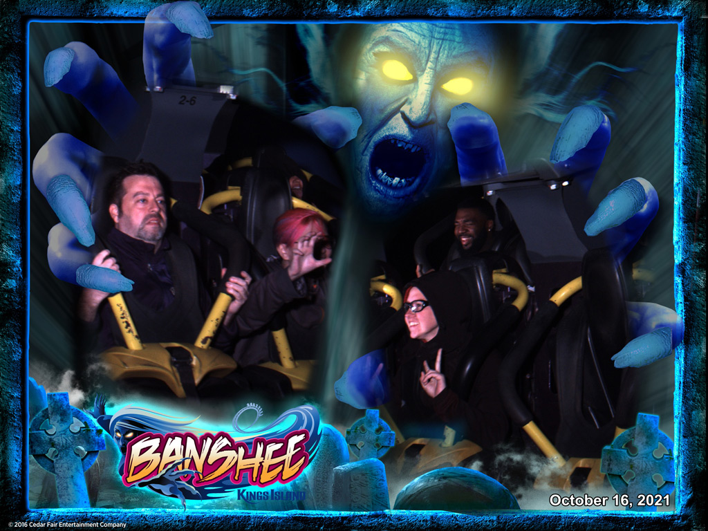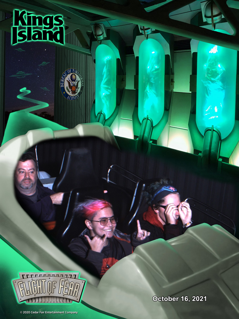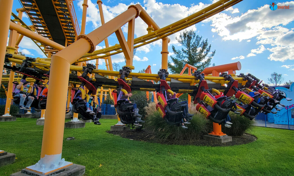 As for Flight of Fear, both Sam and Kaylee rode this coaster’s sister coaster at Kings Dominion for their first times in 2021 as well. Both have also ridden Joker’s Jinx at Six Flags America (SFA). Having been to Six Flags Fiesta Texas (SFFT), I’ve also experienced Poltergeist. With the numerous installments of these Premier Rides spaghetti bowl coasters on our credit lists, we all had a chat after the ride, talking about what we liked, disliked, and prefer about the indoor and outdoor versions. Our consensus is that we like the Flight of Fears for theming, obviously, and give Kings Island’s the edge over Dominion’s. As for the ride itself, Joker’s Jinx is our favorite. The mid-course brake run on both Flight of Fear models leaves a little bit to be desired and Kings Island’s came to a full stop on our ride. At least Dominion’s only slows you down to a crawl. I wonder why the Flight of Fear coasters have the mid-course?