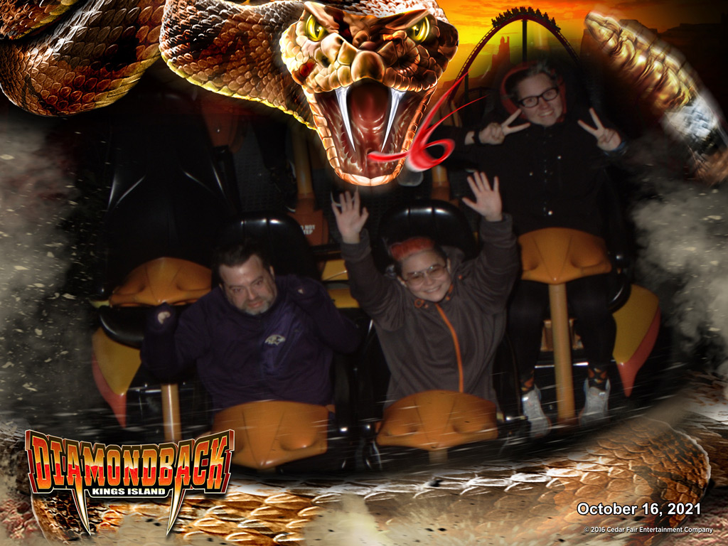 After waiting in long lines all night, we lucked out after riding Banshee, grabbing a bite to eat, and scooping up the last of our souvenirs. There was still 15 minutes before the park closed. I asked Sam and Kaylee if we could run over to Diamondback for one last re-ride. I love when parks let you get in line all the way up until close and Kings Island is one of those parks. While I do understand why parks shut lines down early, especially on slower moving and lower capacity rides, something like Diamondback can move the crowds.