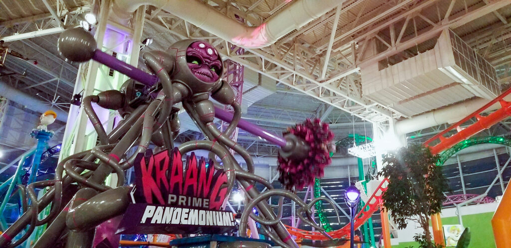 I agree 100 percent. This park didn’t pack itself with the same generic flat rides you see at every park. And where they did, they more than made theirs stand out with their Nickelodeon theming. Even ride signage throughout this park becomes an attraction in itself. Just look at the pendulum ride above, Kraang Prime Pandemonium. The park could have just as easily stuck a small, standard pendulum down and called it a day. Not so, however. I can’t even begin to describe the level of details on the ride and its surroundings. There are light packages galore too. I didn’t expect this level of detail and pictures probably don’t even do it justice.