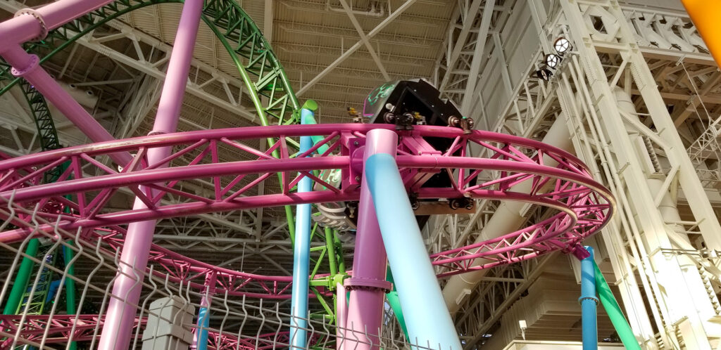 The first of two spinning coasters at Nickelodeon Universe was the coaster that weaves in and out of TMNT Shellraiser about a million times. Okay, maybe that’s a stretch, but Gerstlauer, who designed both rides, had to have designed these together at the same time to occupy this space. At one point, while going up the lift hill, the three of us were even trying to see if the two rides shared any support structure. There are beams going every which way in this mess of track. I mean mess in a good way, though.