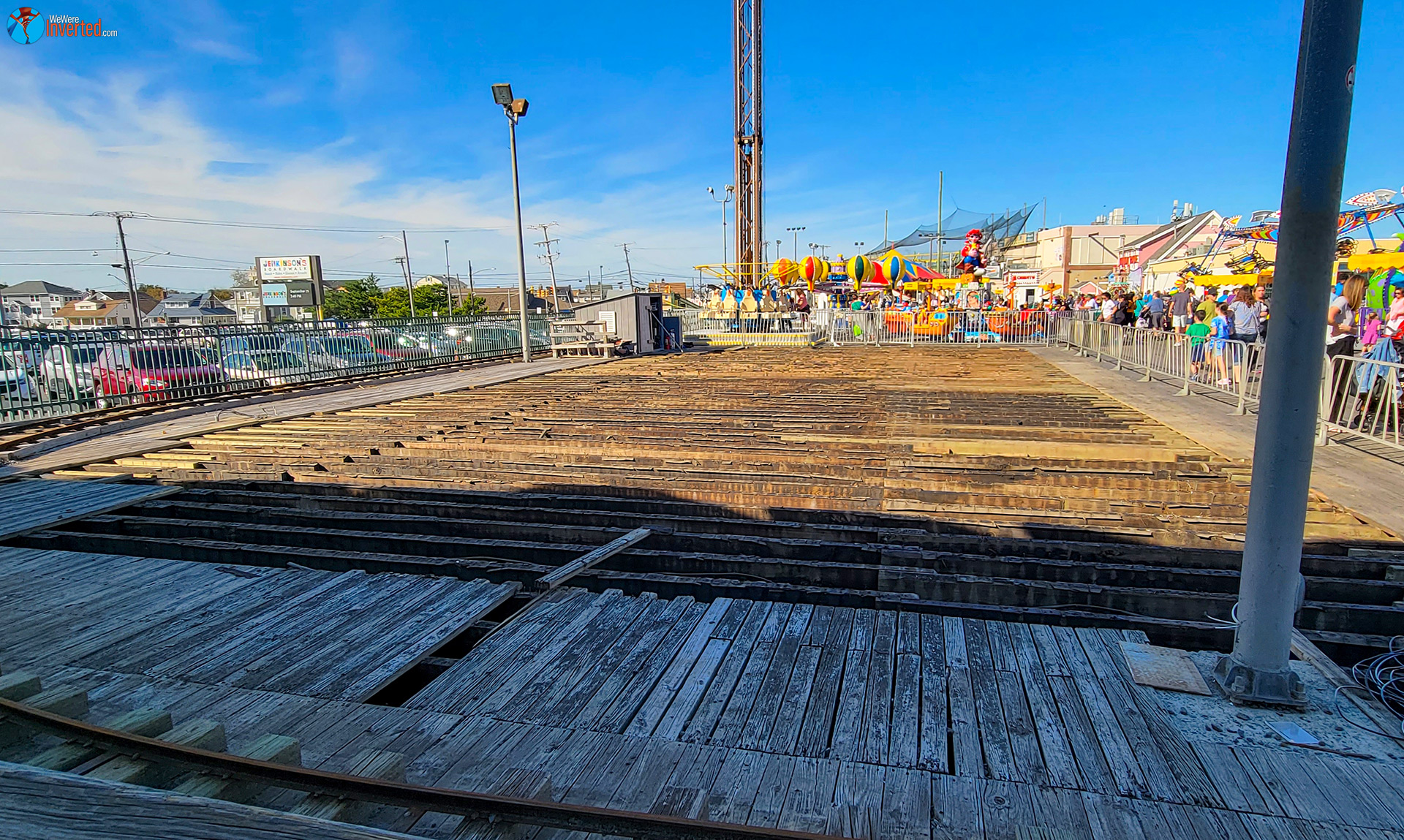 Once I entered the park, I decided to walk around and get the lay of the land. I took some photos and filmed some more footage. While doing so, however, I noticed something strange. By the bumper cars a huge area of ripped up boardwalk laid right next to the train tracks. I filmed it and wondered if the park was doing some repair work to the boards. I then moved on to find the park’s second coaster, Tornado.
