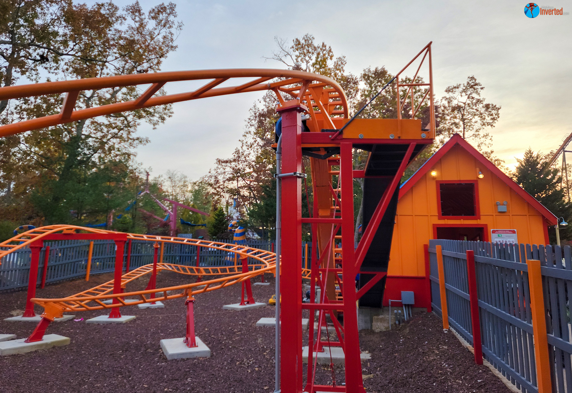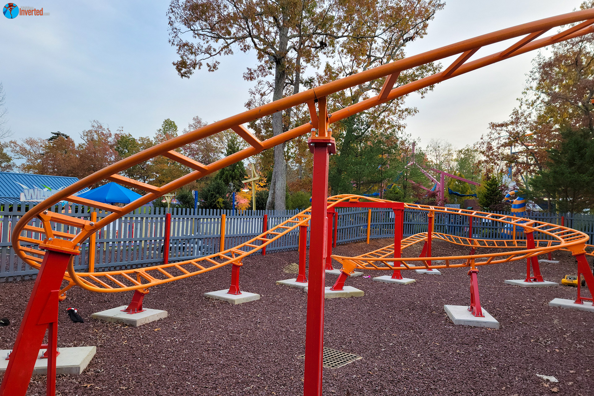 Throughout 2020 the blue track from Road Runner laid in the lot not too far away from Nitro’s lift hill. Then, earlier this year, some of that track had been repainted to orange. That’s when I knew they were going to reinstall it. I didn’t know they’d give it the name Lil’ Devil Coaster, however, so that was kind of neat. At least it wasn’t given a DC Comics name too.